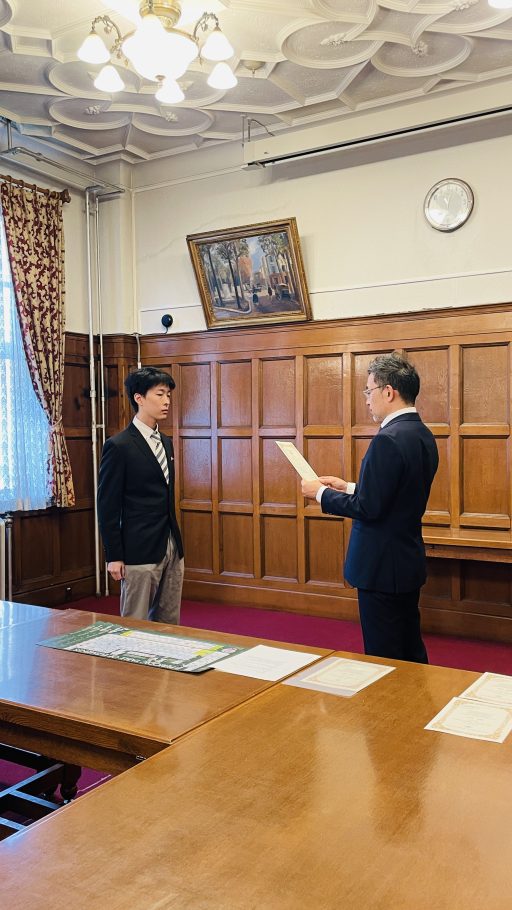 授賞式は9月22日、理学部本館の大会議室にて執り行われ、柳澤達也物理学科長より賞状が授与されました。